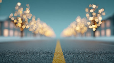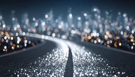 An abstract illustration shows a road leading towards a cityscape with glowing lights. The composition uses a shallow depth of field, with the road in sharp focus and the background blurred. The color palette includes blues, whites, and oranges, suggesting a night scene. This image is suitable for various commercial uses.