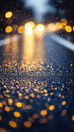Blurred city lights reflected on wet asphalt with bokeh effect and rain falling, creating a beautiful abstract background