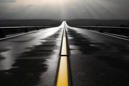 Road illuminated with yellow lights and central line leading into the glowing distance, symbolizing journey, guidance and direction.