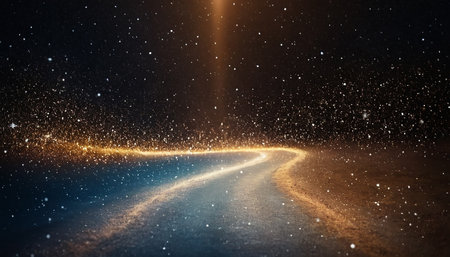 A dark, starry expanse with a luminous, winding path of golden and blue light. Tiny white and gold particles are scattered throughout, creating a sense of depth and movement. A bright beam of light shines down from the upper center.