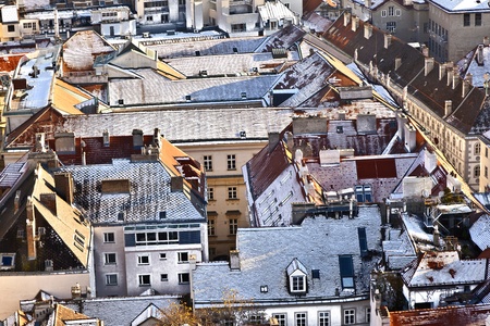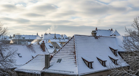 Snowy rooftops of old European buildings with tiled roofs and chimneys under a cloudy winter sky.