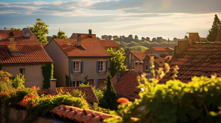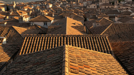 The warm afternoon light illuminates the terracotta rooftops of an old Mediterranean village, highlighting their unique architectural details and rich colors.