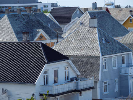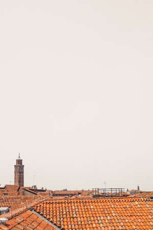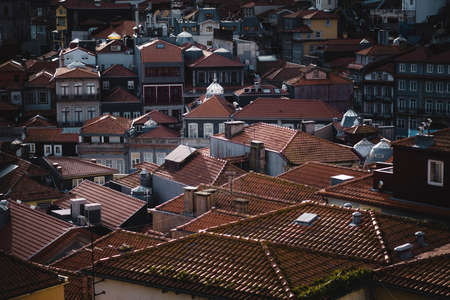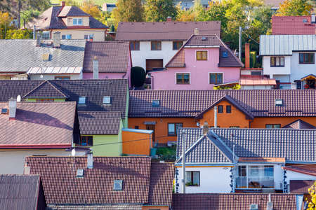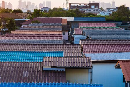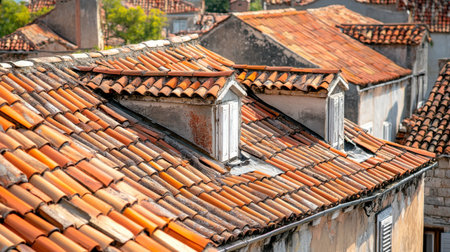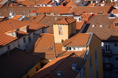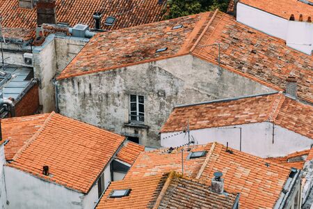 Roofs of houses background. Roof texture pattern. Rooftop background. Rooftop covered with ceramic shingles. Roof Tiled covering of building. Weathered roof of an old house in town. Roof tiles.