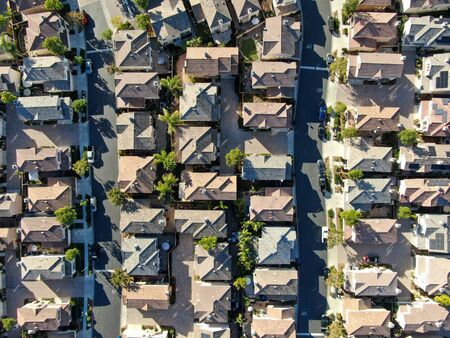 Aerial top view of upper middle class neighborhood with residential house next to each other in Chula Vista, California, USA.