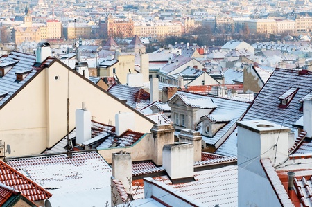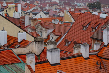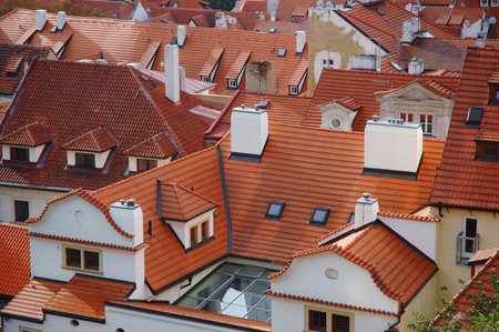 Top view to red tile roofs of Prague city Czech republic. Typical Prague houses.