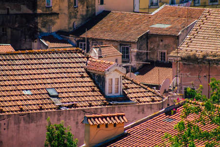 Lisbon Portugal August 01, 2020 View of roof of ancient historical buildings in the downtown area of Lisbon, the coastal capital city of Portugal and one of the oldest cities in Europe