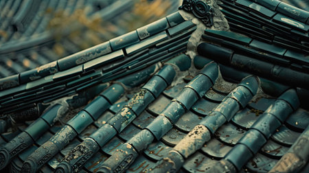 A serene close-up view of weathered roof tiles covered in moss, set against a peaceful forest backdrop, showcasing nature's beauty and craftsmanship.