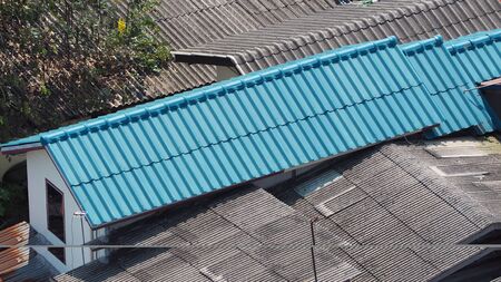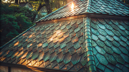 striking beauty of a metal tile roof against a dark navy blue background. Evokes modernity and vibrancy in urban architecture.