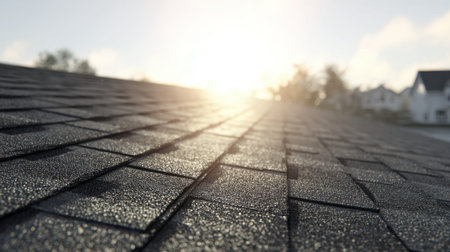 A close-up view of textured asphalt shingles on a rooftop reflecting early morning sunlight, creating a serene atmosphere in a peaceful residential neighborhood.