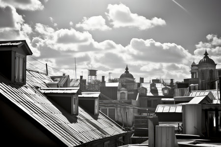 Abstract image of asian slums, dense village, house roof in black and white monochrome photo