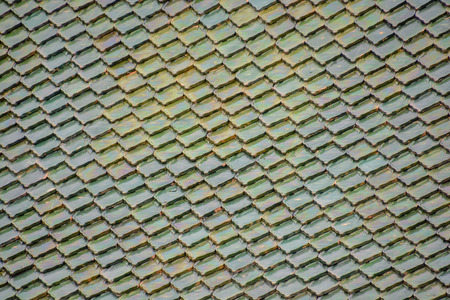Top aerial view of building green shingle tiled roof construction. Abstract background, geometrical pattern.