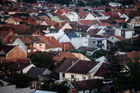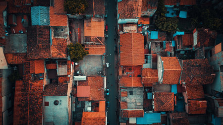 Red rooftops shot from drone, old houses in the summer afternoon light