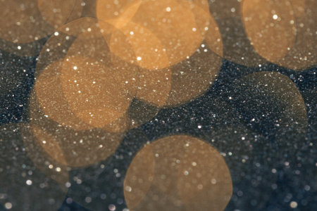 Soft, out of focus bokeh lights in golden yellow and blue tones are scattered across a dark, textured glitter background, with a bright lens flare adding a highlight.
