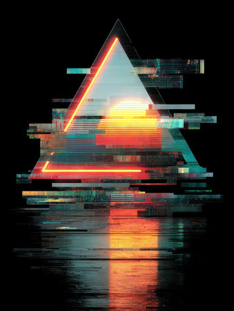 Colorful abstract glitch art featuring a triangular shape with a sunset reflection. The vibrant neon colors create a visually striking composition against a dark background.