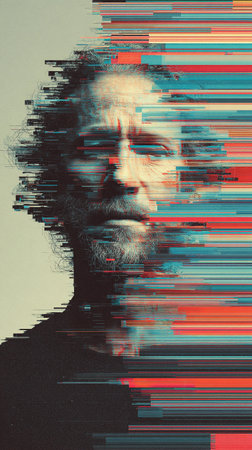 Creative digital artwork depicting a man's face with distorted effects in vibrant colors against a neutral background