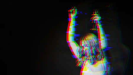 Party joy. Inspired woman. Holiday drink. Festive mood. Happy dreamful lady closing eyes holding champagne glass up long exposure defocused rgb glitch effect isolated black copy space.