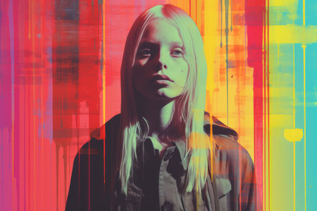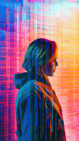 A close-up of a young woman with expressive features is beautifully blended with vibrant abstract digital patterns and colors, creating an artistic effect.
