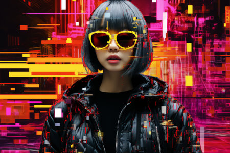 Futuristic abstract portrait of smart woman looking at camera with digital glitch with vibrant neon light. Young beautiful female staring at camera represent digital robotic simulated human. AIG42.