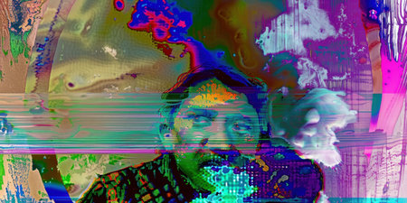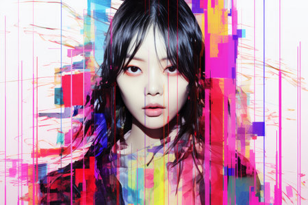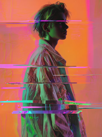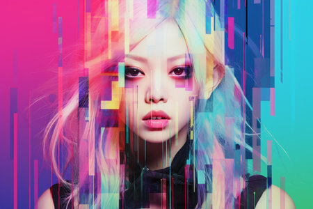 Glitch effect creates a distorted portrait with vibrant colors and sharp contrasts