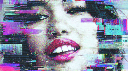 Close-up of a womans face featuring bold colors and glitch art effects. The image captures a blend of beauty and digital distortion in an engaging way.