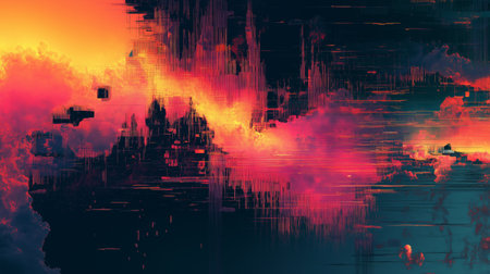 Digital decay and distortion showcasing glitch effects in vibrant colors across a skyline