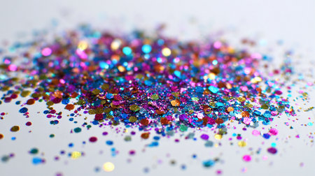 Tiny particles of glitter scatter across a smooth surface, reflecting light and creating a dazzling array of colors and textures.