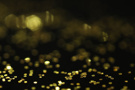 Golden glitter scattered on the black card background, top view, selective focus