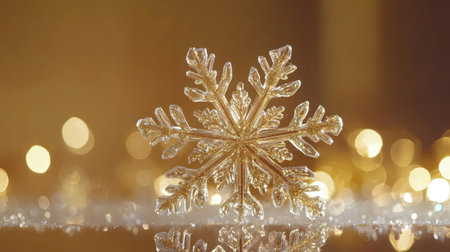 A detailed crystal snowflake ornament hangs from a tree branch, illuminated by soft bokeh lights in a festive atmosphere.