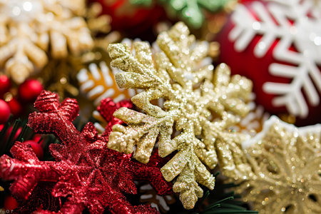Christmas tree decorated with golden snowflakes and garlands, close up