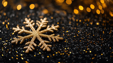 This stunning image features a golden snowflake adorned with glitter, set against a rich black background, perfect for holiday themes and festive celebrations.