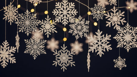 This image presents an arrangement of white snowflakes suspended against a dark backdrop. String lights add a soft glow, enhancing the festive atmosphere. The composition emphasizes a decorative aesthetic, suitable for use in design projects, advertising, or creating a seasonal visual impact, focusing on winter celebrations.