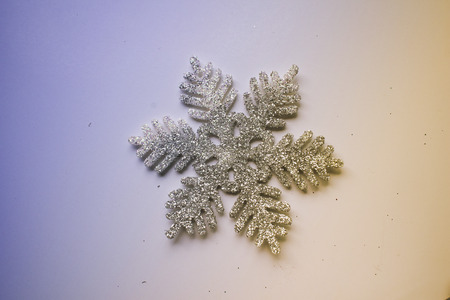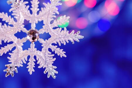 Christmas snowflake on a blue, selective focus at the bottom of picture. Close-up.