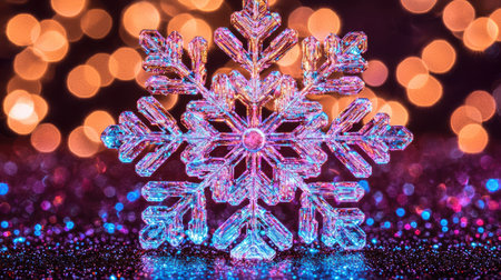 This stunning image features a crystal snowflake ornament elegantly illuminated by a vibrant bokeh background, capturing the essence of winter magic and holiday spirit.