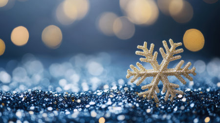 Blue sparkling snowflake ornament on a shimmering snowy background. Perfect for Christmas and New Year festive themes.