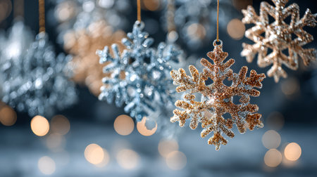 Delicate, shimmering snowflake decorations dangle gracefully, set against a softly blurred backdrop of holiday lights that evoke warmth and festive cheer.