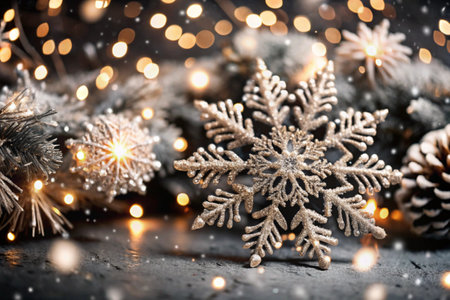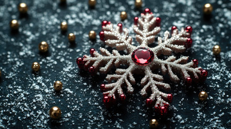 Intricate snowflake decoration captivates with glimmering crystals and festive ambiance.