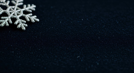 A sophisticated moody shot frames a glittery silver snowflake decoration positioned on a dark blue velvet-like surface, featuring soft ambient lighting and ample blank area.