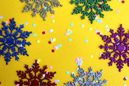 Colorful holiday decorations lie scattered on a blue surface featuring sparkling ornaments snowflakes and shiny beads. These items create a joyful festive atmosphere.