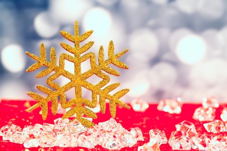 Christmas golden snowflake on ice cubes with blue lights bokeh background