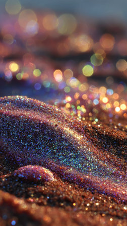 This captivating image features a shimmering glitter surface with vibrant bokeh lights and soft pastel colors. It creates a dreamy and enchanting atmosphere, perfect for artistic projects or festive themes.