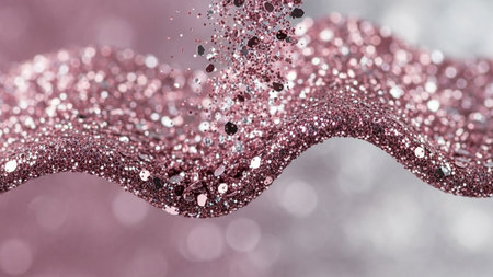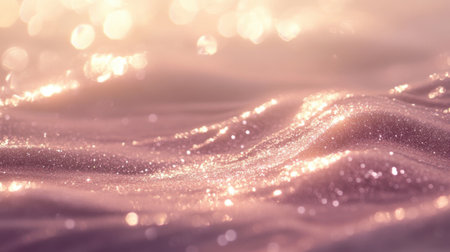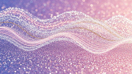 An abstract composition featuring undulating waves formed by countless shimmering glitter particles. The color palette consists of soft, dreamy pastel shades of pink and purple, creating an ethereal and magical atmosphere. The light catches the tiny particles, causing them to sparkle and glow, giving the impression of movement and fluidity. This luminous texture is both delicate and vibrant, evoking feelings of elegance, celebration, and luxury. It serves as a visually background or