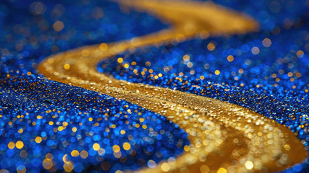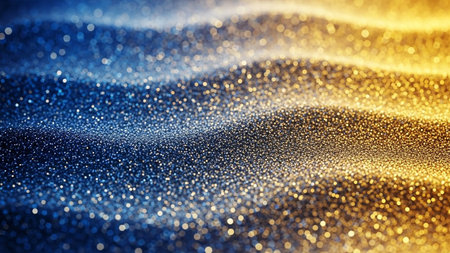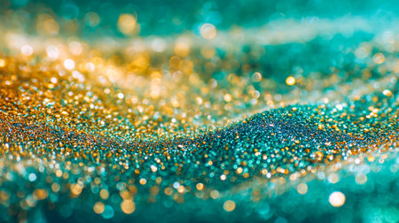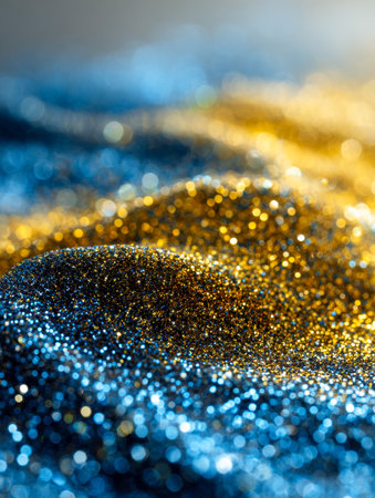 A stunning close-up of glitter particles shimmering in shades of gold and blue. The blurred background enhances the sparkling effect, adding a festive touch.