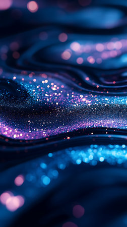 A mesmerizing blue wave formation sparkles with glitter, surrounded by a dreamy backdrop of softly blurred lights. The image captures the essence of fluid motion in an artistic display.