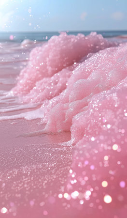 Soft pink froth lines the shore, blending into the sandy beach