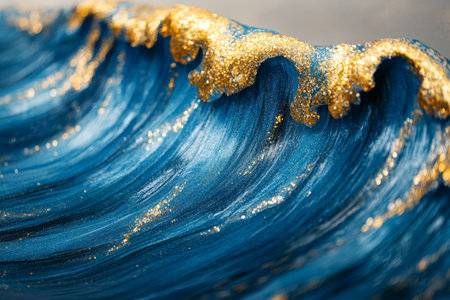 Swirls of deep blue are combined with sparkling golden flecks, creating an enchanting abstract pattern resembling shimmering waves. The design evokes a sense of tranquility and depth.