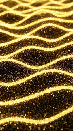 An abstract pattern of golden glitter particles forms undulating waves against a dark background, creating a shimmering, sparkling, and luminous texture.
