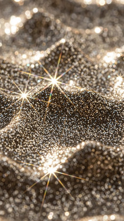 A close-up view of dark glitter forming rippling waves, with scattered colorful sparkles and bright starburst highlights from sunlight.
