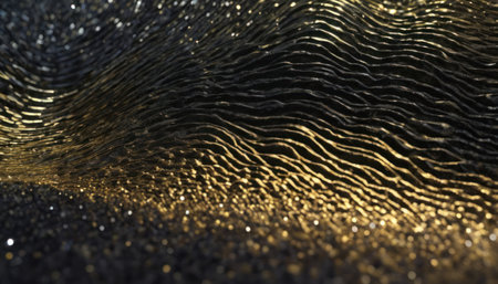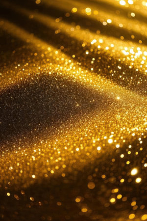 Abstract close-up of golden glitter particles forming a wavy surface with soft bokeh lights against a dark background, creating a texture.