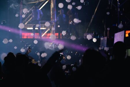 Stage lights and crowd of audience with hands raised at a music festival. Fans enjoying the party vibes.
