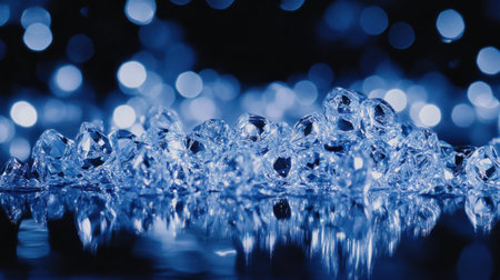 This stunning image features crystal clear diamonds scattered across a shiny surface, enhanced by a captivating blue bokeh background and sparkling reflections.